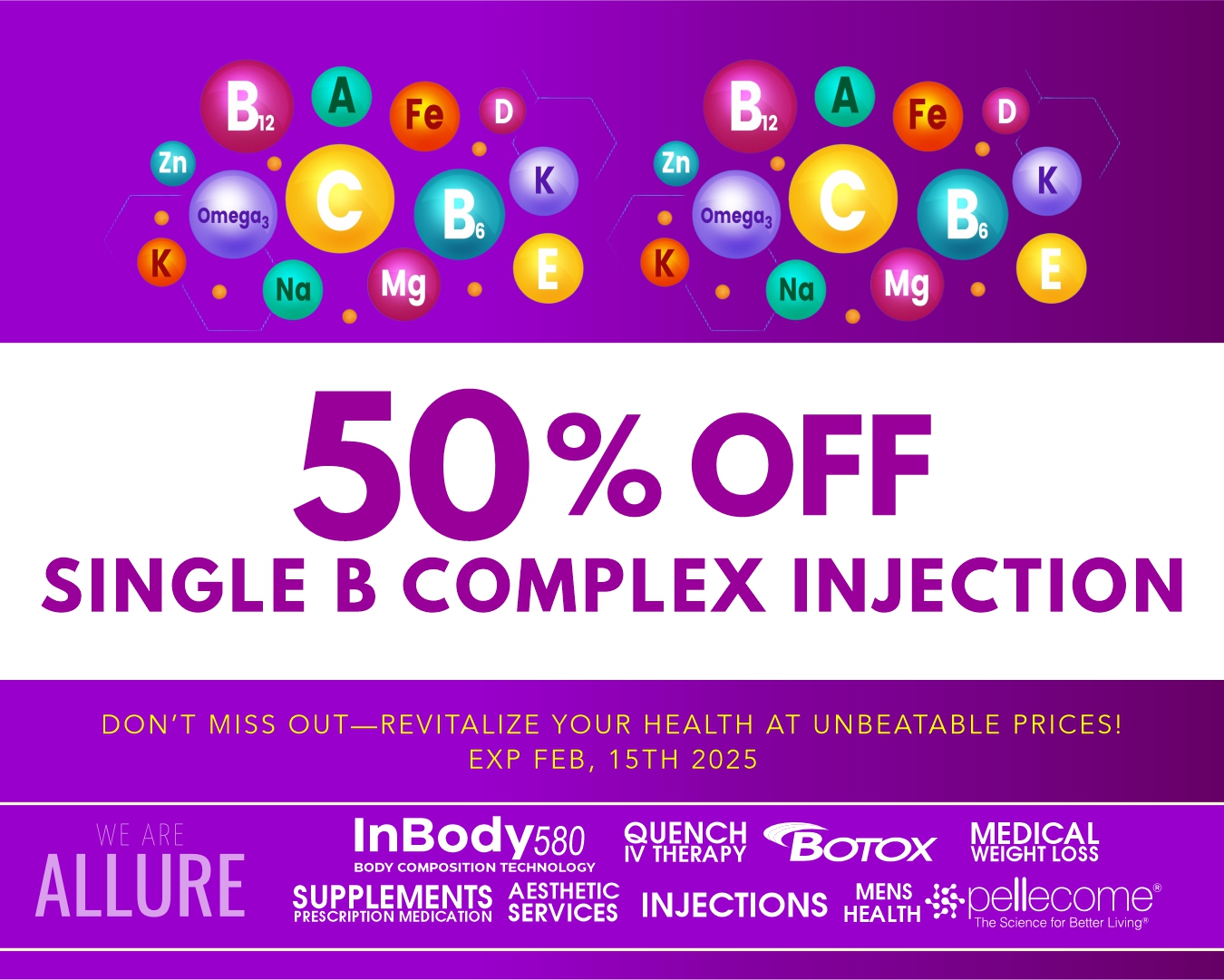 Looking to improve your health in 2025? Take advantage of the February Wellness Deals at Allure Medical Weight Control and Wellness! We are offering exclusive discounts on B12 shots, weight loss treatments, body sculpting, and prescription savings. These deals are only available until February 15, 2025, so don’t miss out!